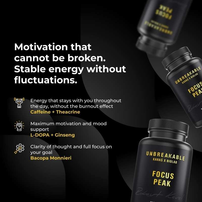 Focus Peak is an intensely balanced pre-workout formula designed to enhance alertness, focus, and motivation before training, as well as support mental engagement in daily tasks. In the spirit of the Unbreakable line, the formula combines proven stimulants with natural nootropics and adaptogens to support not only strength and endurance but also a sharp, focused mind. It’s perfect for anyone looking to maximize their potential — not only athletes but anyone striving for better performance and motivation.