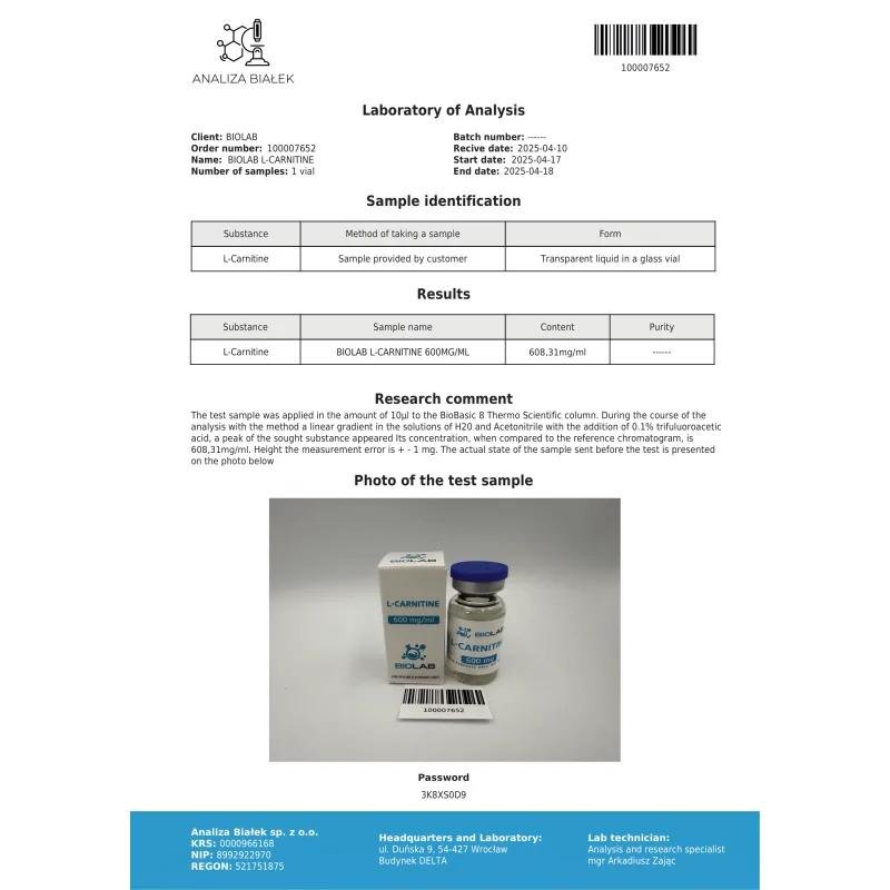 L-Carnitine is a natural component of the body and aids in the absorption of fatty acids into the bloodstream for further fat burning. L-carnitine is responsible for transporting medium- and long-chain fatty acids across mitochondrial membranes, promoting their oxidation and subsequent energy production. In addition, it supports the transport of intermediate toxins out of the mitochondria, preventing their accumulation.