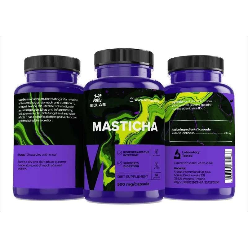 Mastika is a supplement from the category supporting normal bowel function. Mastix is a resin extracted from the Pistacia lentiscus var. Chia tree, a low evergreen tree with a thousand-year tradition of cultivation and use. Mastica is a mixture of hundreds of compounds, which may explain its wide spectrum of action. There are more than 60 biologically active compounds in mastic resin essential oil alone.